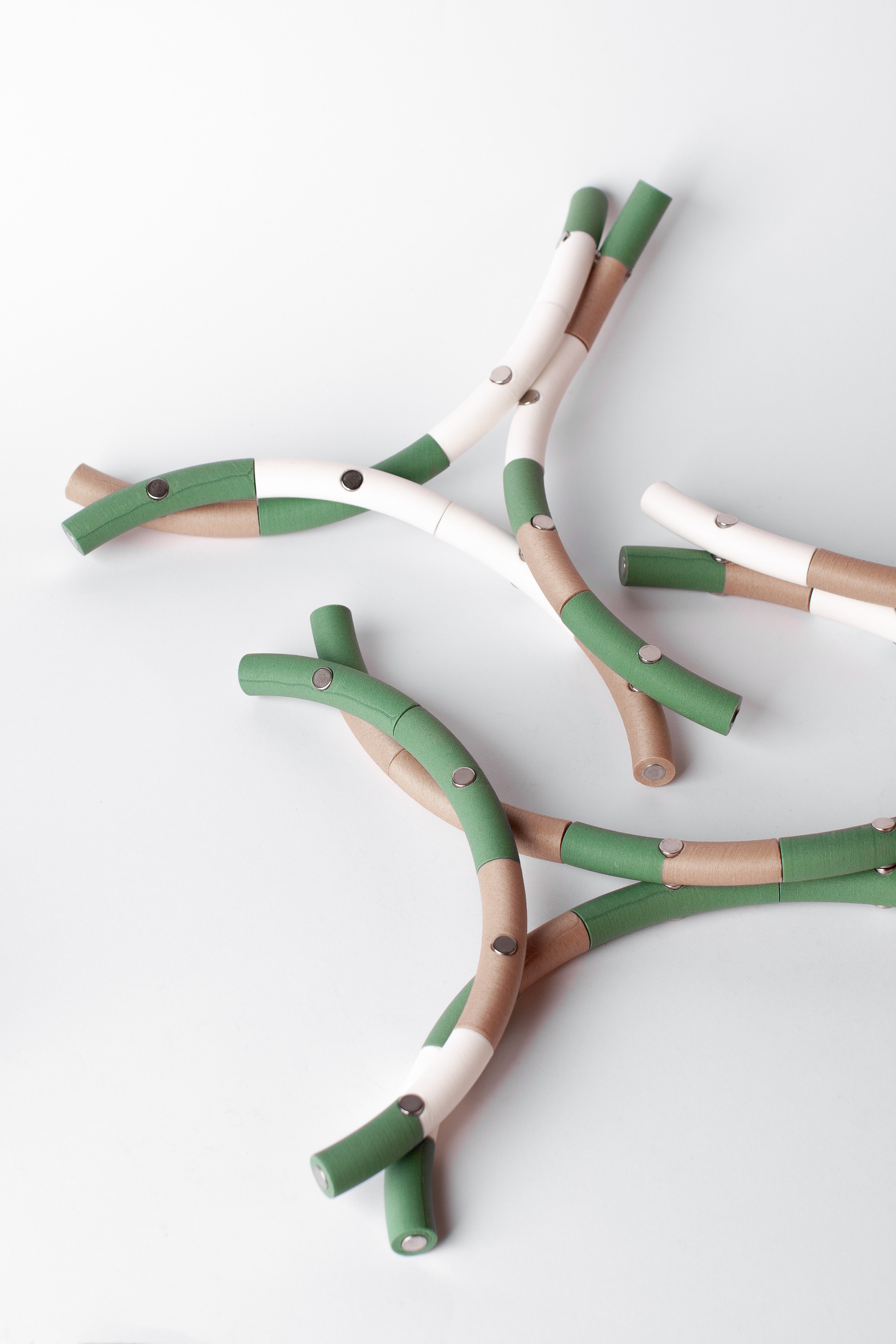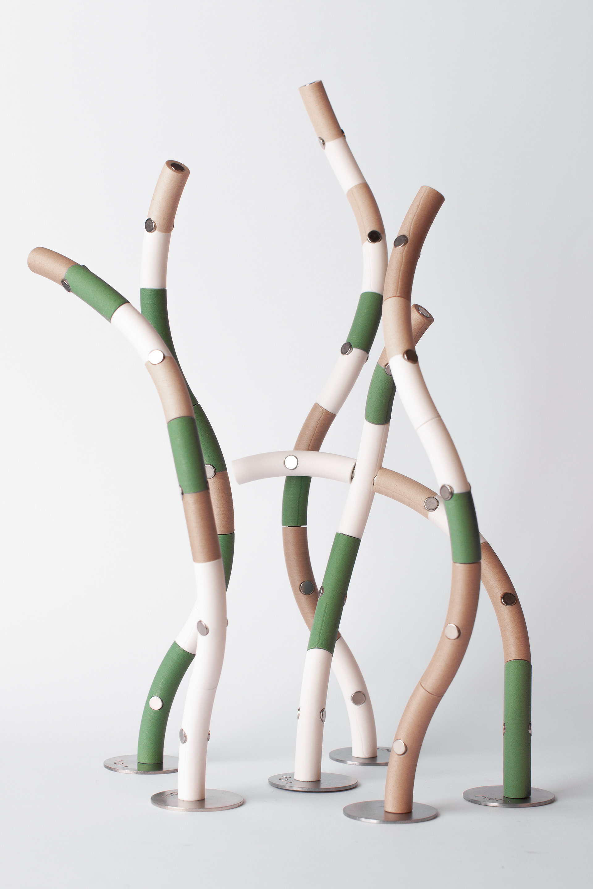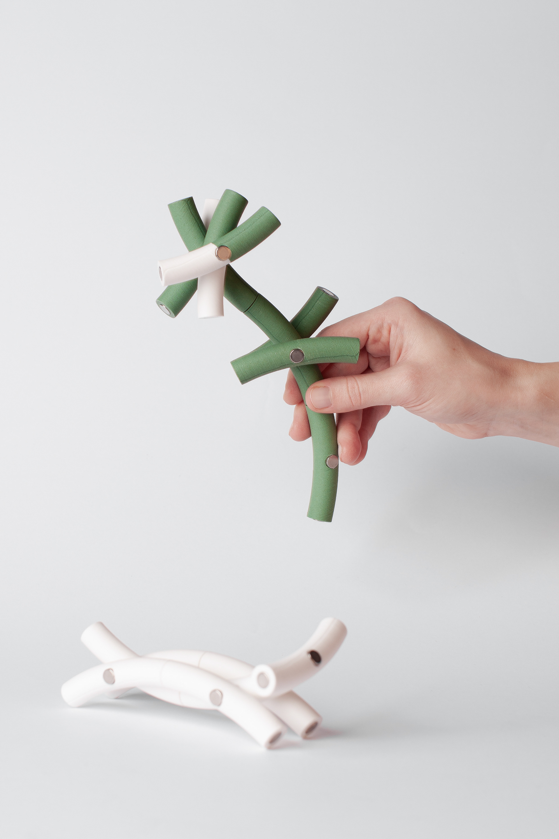 Set of cylindrical modules inspired by plant growth structures. Each element is based on branching proportions and developmental angles found in L-systems, phyllotaxis, and fractal patterns - mathematical models that reflect how form emerges in nature.