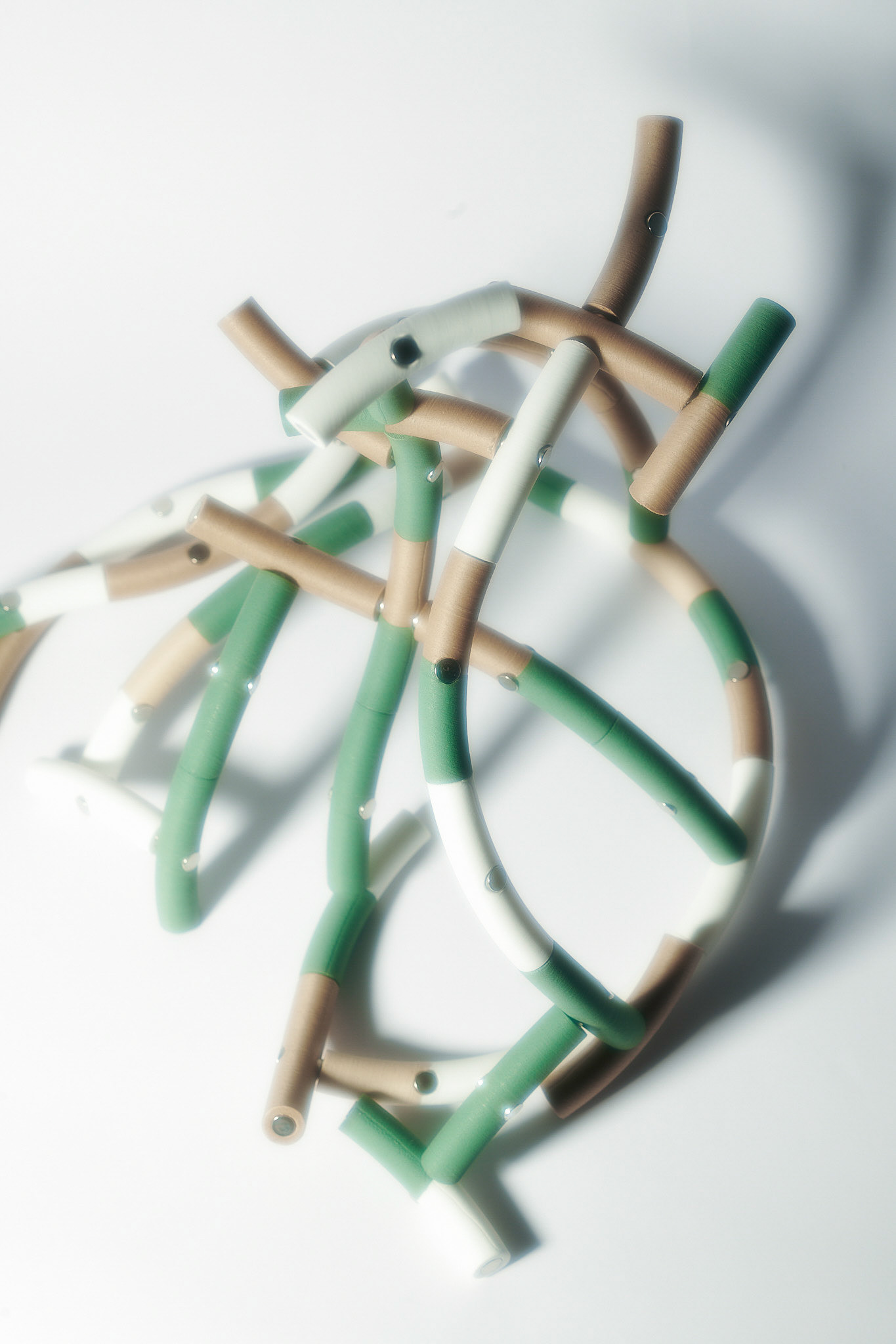 Set of cylindrical modules inspired by plant growth structures. Each element is based on branching proportions and developmental angles found in L-systems, phyllotaxis, and fractal patterns — mathematical models that reflect how form emerges in nature.
