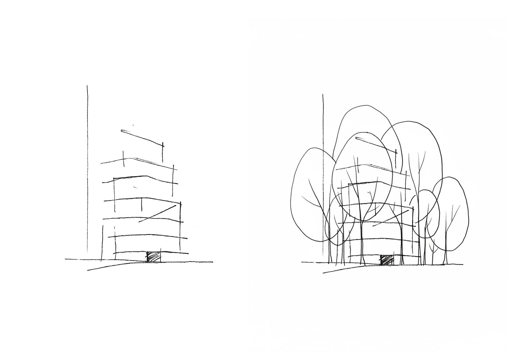 The structure is based on a telescopic mechanism - each level folds into the one below, with the lowest disappearing into the ground. Offices, public buildings, and other spaces not in use can temporarily give way to meadows, gardens or urban farms.