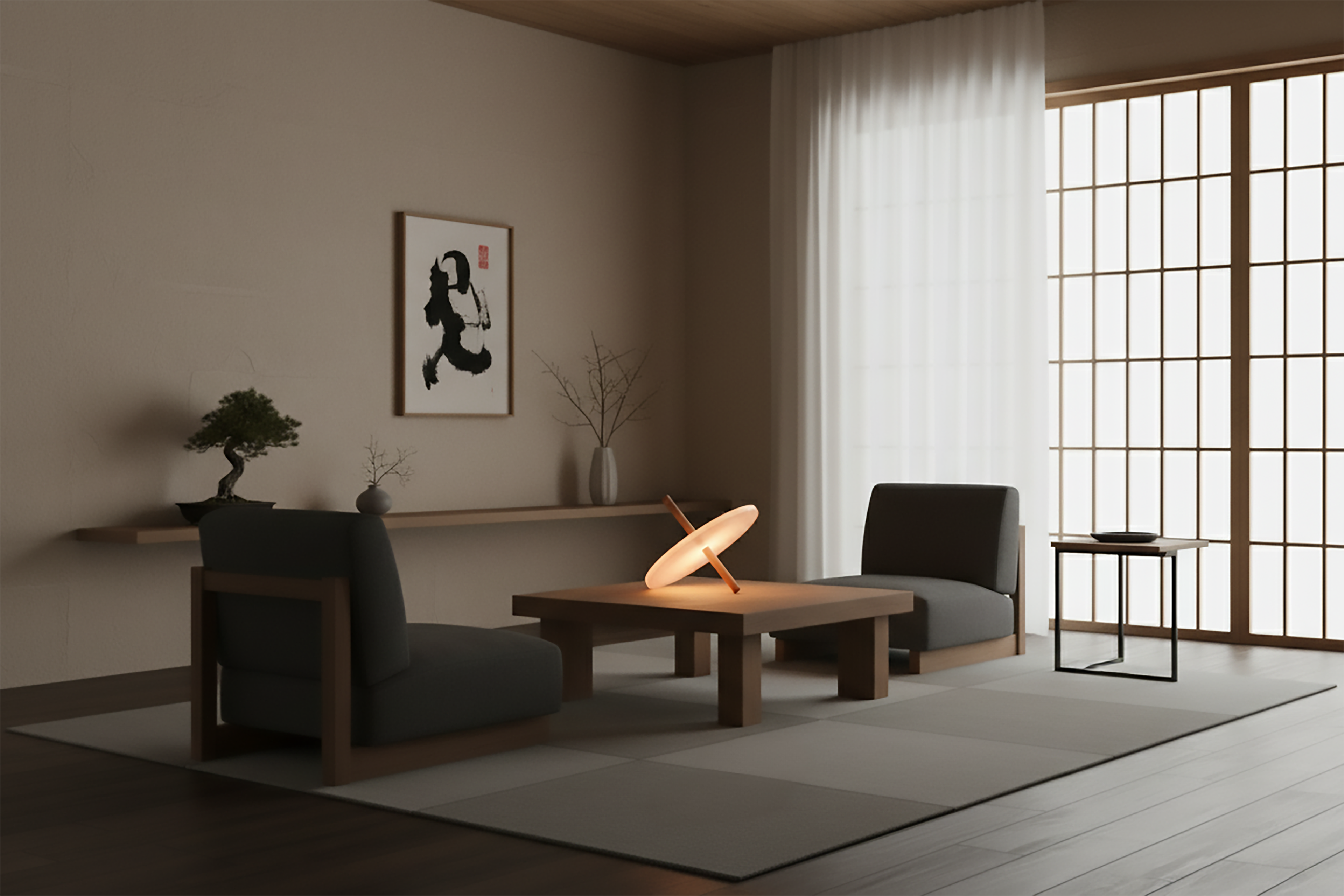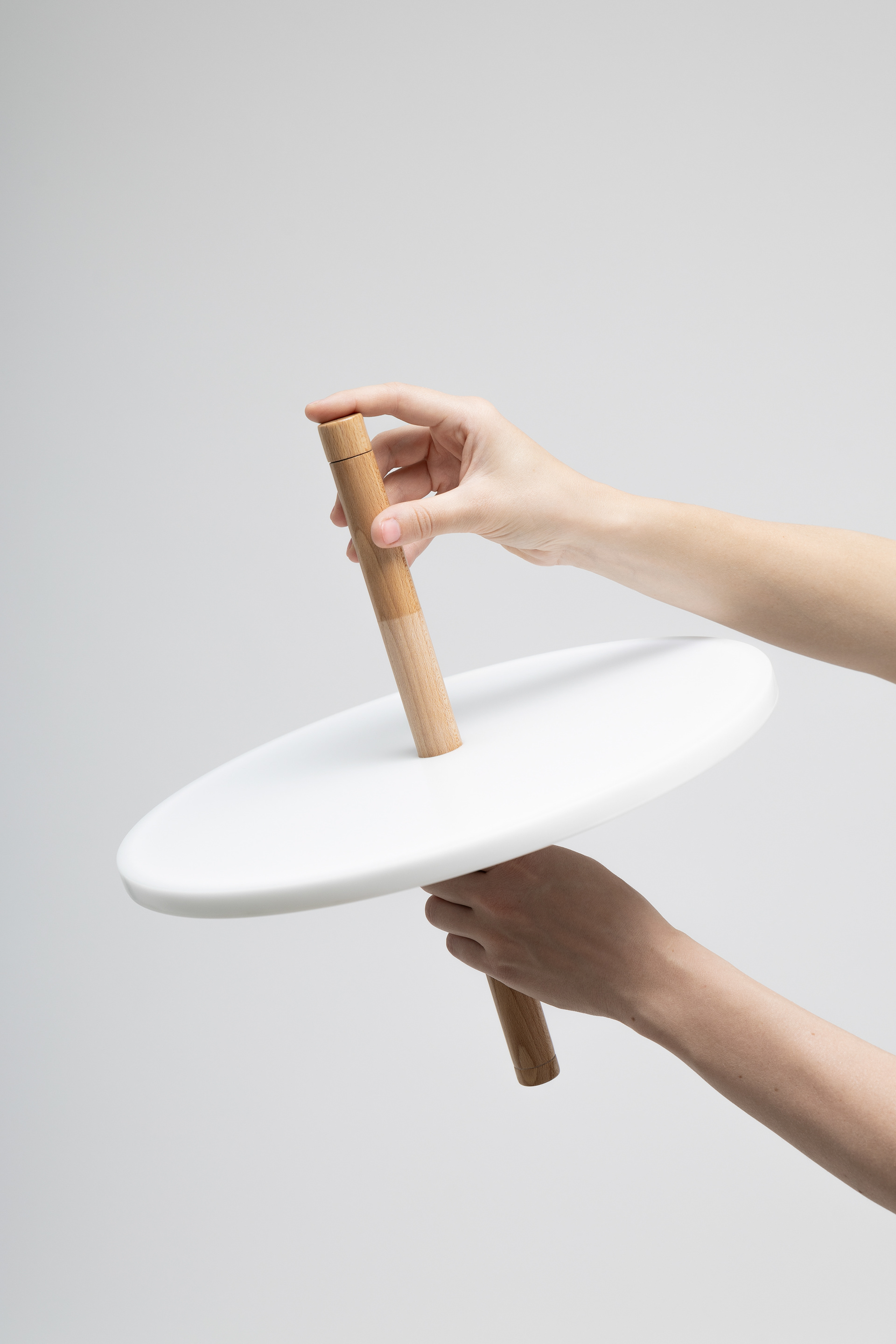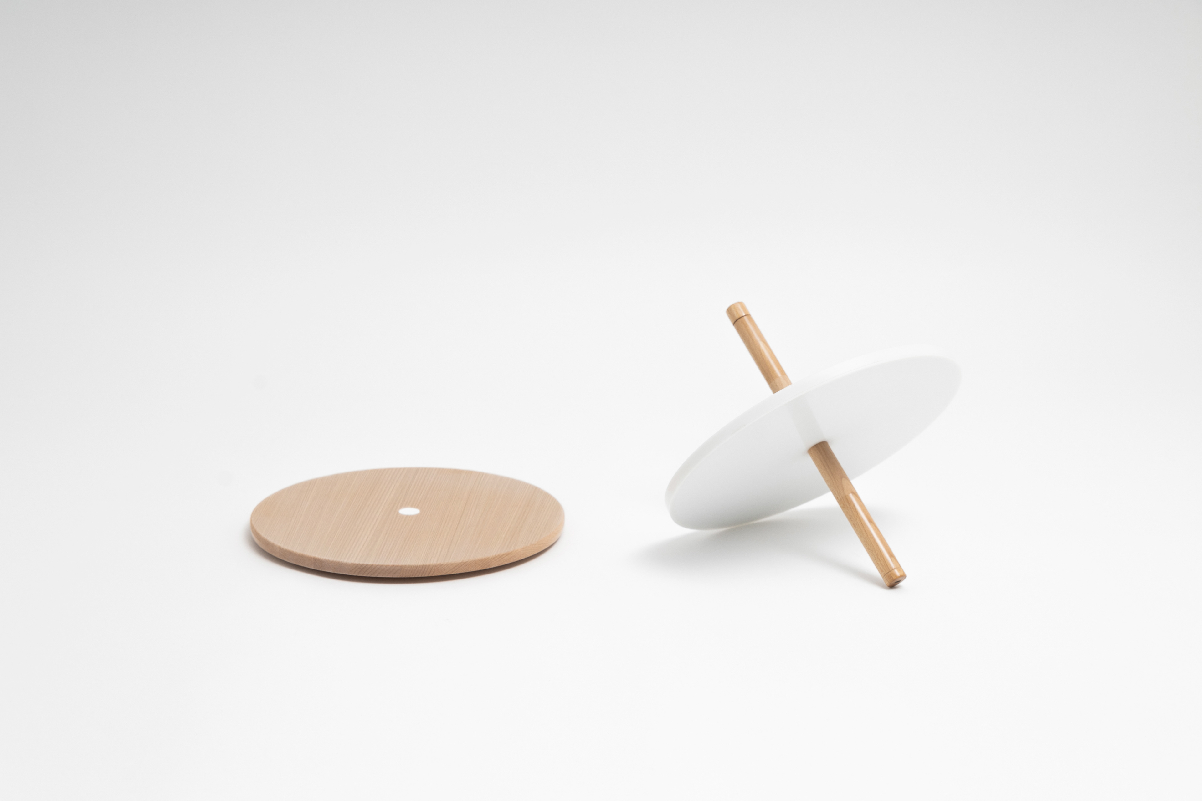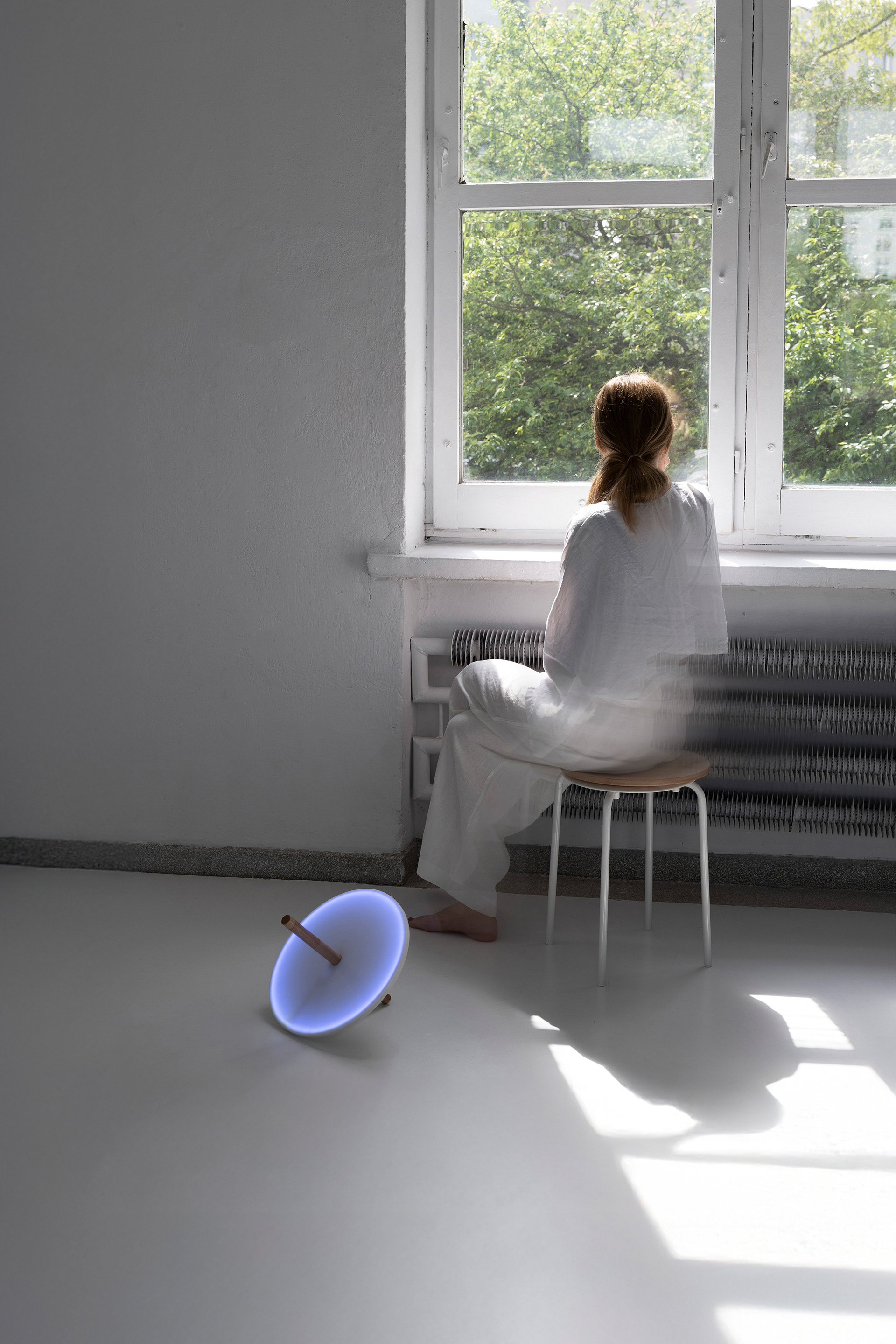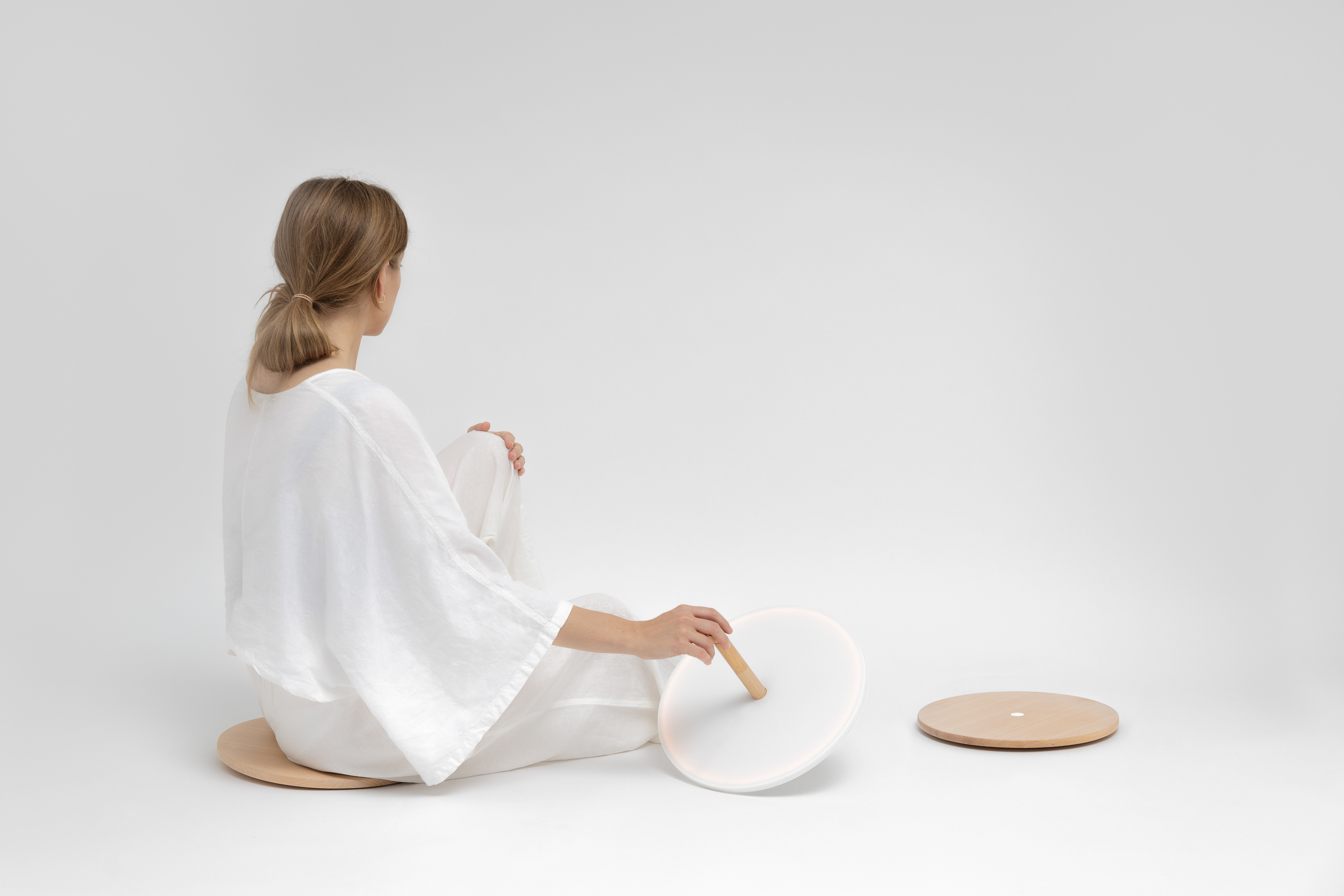 The seat, inspired by the japanese zaisu, features a subtle convexity that enables gentle rocking. It can be used directly on the floor or as an overlay on other surfaces. When paired with the lamp, it serves as the base for the standing lamp configuration.